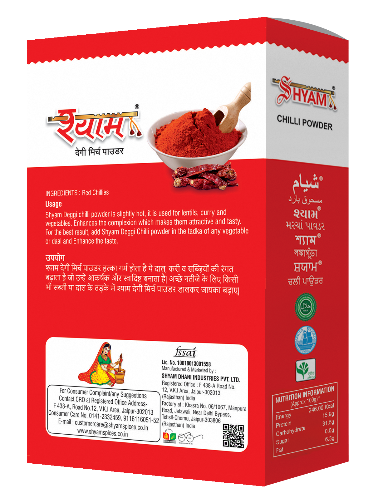 Shyam Deggi Mirch Powder is a special spice blend made from selected chillies that add rich color and medium spiciness to your food. It brings out the bright red look of curries and gravies while giving them a balanced, flavorful taste. Perfect for Indian dishes, it makes everyday cooking more vibrant and delicious.